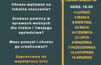 Zapraszamy na nasze comiesięczne spotkania wszystkich mieszkańców, którym zależy na wspólnym kształtowaniu przestrzen