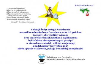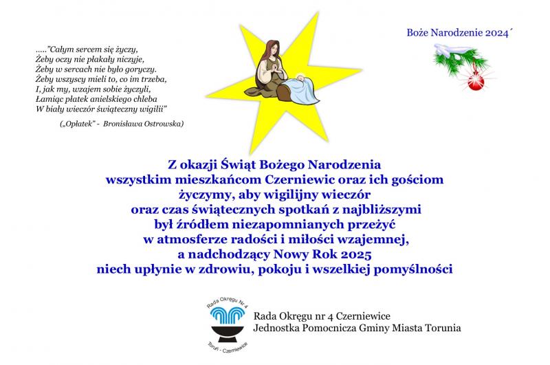 Z okazji Świąt Bożego Narodzeniawszystkim mieszkańcom Czerniewic oraz ich gościomżyczymy, aby wigilijny wieczór oraz czas świątecznych spotkań z najbliższymibył źródłem niezapomnianych przeżyć w atmosferze radości i miłości wzajemnej,a nadchodzący Nowy Rok 2025niech upłynie w zdrowiu, pokoju i wszelkiej pomyślności