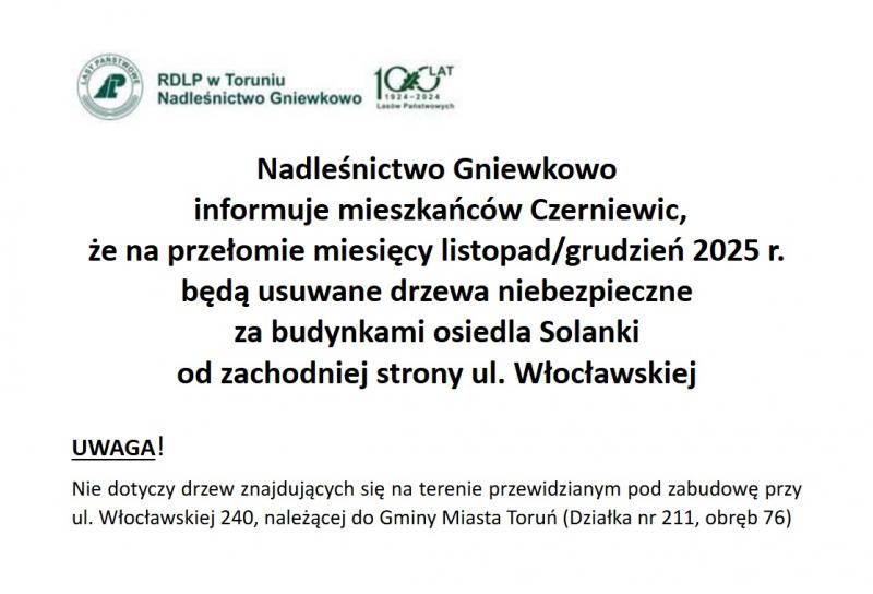 Nadleśnictwo Gniewkowo informuje mieszkańców Czerniewic, że na przełomie miesięcy listopad/grudzień 2025 r.będą usuwane drzewa niebezpieczneza budynkami osiedla Solankiod zachodniej strony ul. Włocławskiej
